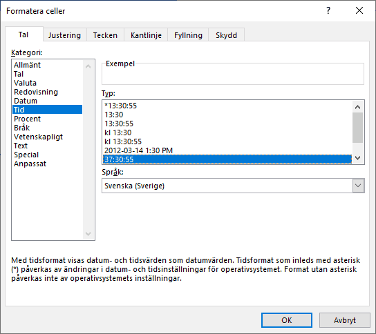 Du kan även använda dig av digitalrutan ”Formatera celler” och kategorin ”Tid” och där välja alternativet 37:30:55. Det valet är det samma som det anpassade formatet ovan.