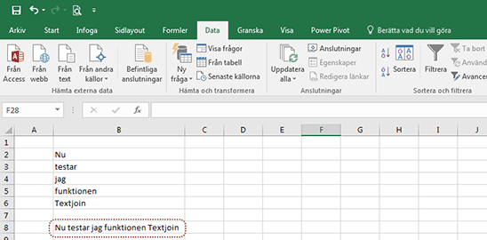 Funktionen TEXTJOIN är en riktigt bra vidareutveckling av funktionen SAMMANFOGA. Förutom att du som tidigare kan ange vilka texter du vill slå samman, genom att markera enstaka celler eller skriva in värden, kan du i TEXTJOIN markera ett helt cellområde och sammanfoga dessa till en textsträng. Du har möjlighet att själv välja separator mellan strängarna, och även utesluta tomma värden i din markering.